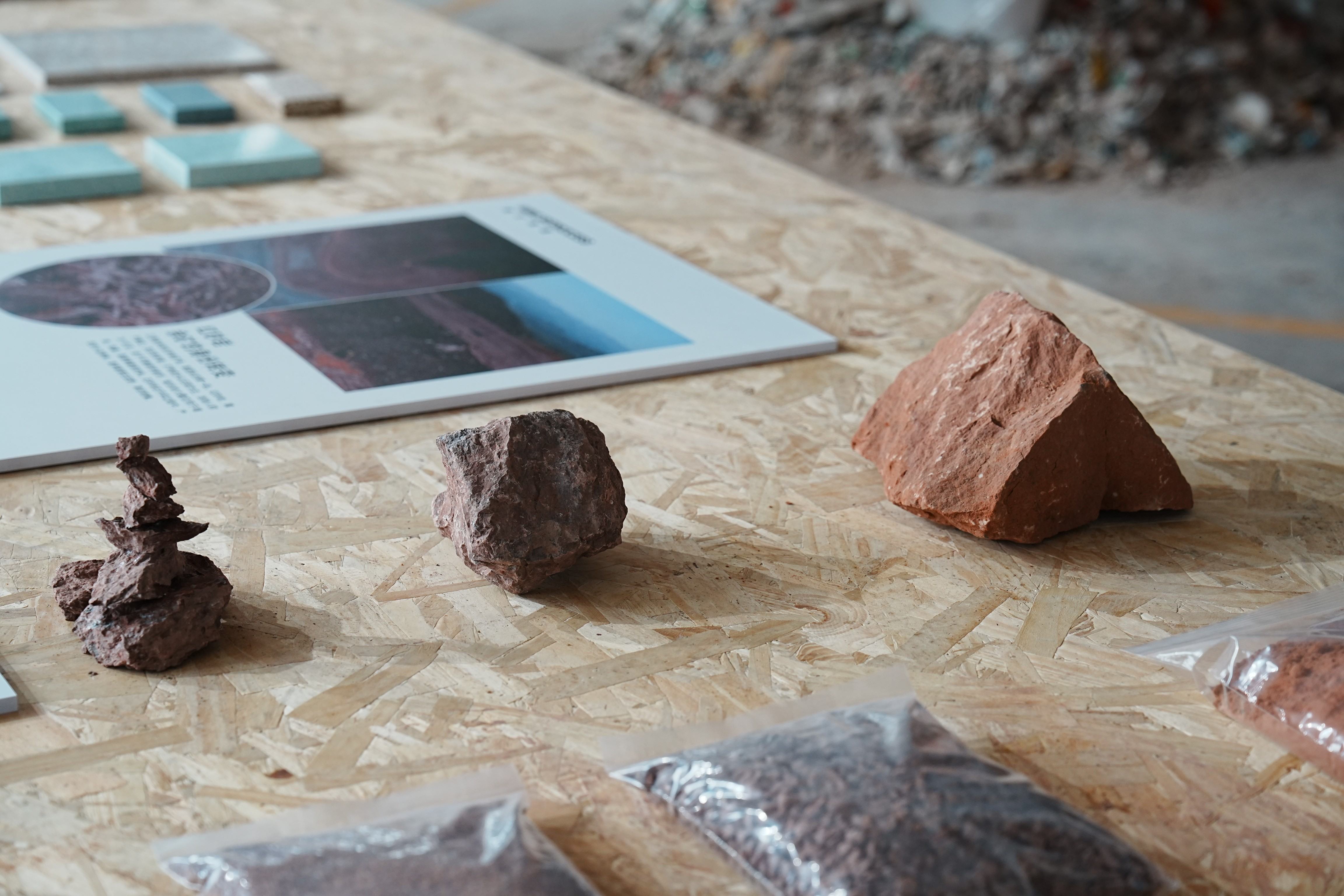 T2M三樓可持續材料圖書館以“材料再生”為核心,圍繞東鵬新材「新礦山計劃」的實踐成果,打造一座“能學能用”的環保資源庫。館內陳列生態石、生態軟瓷、固碳透水磚等用工業廢料再造的低碳建材,并提供綠色建筑場景方案,讓設計師能直接獲取可落地的環保材料數據。
