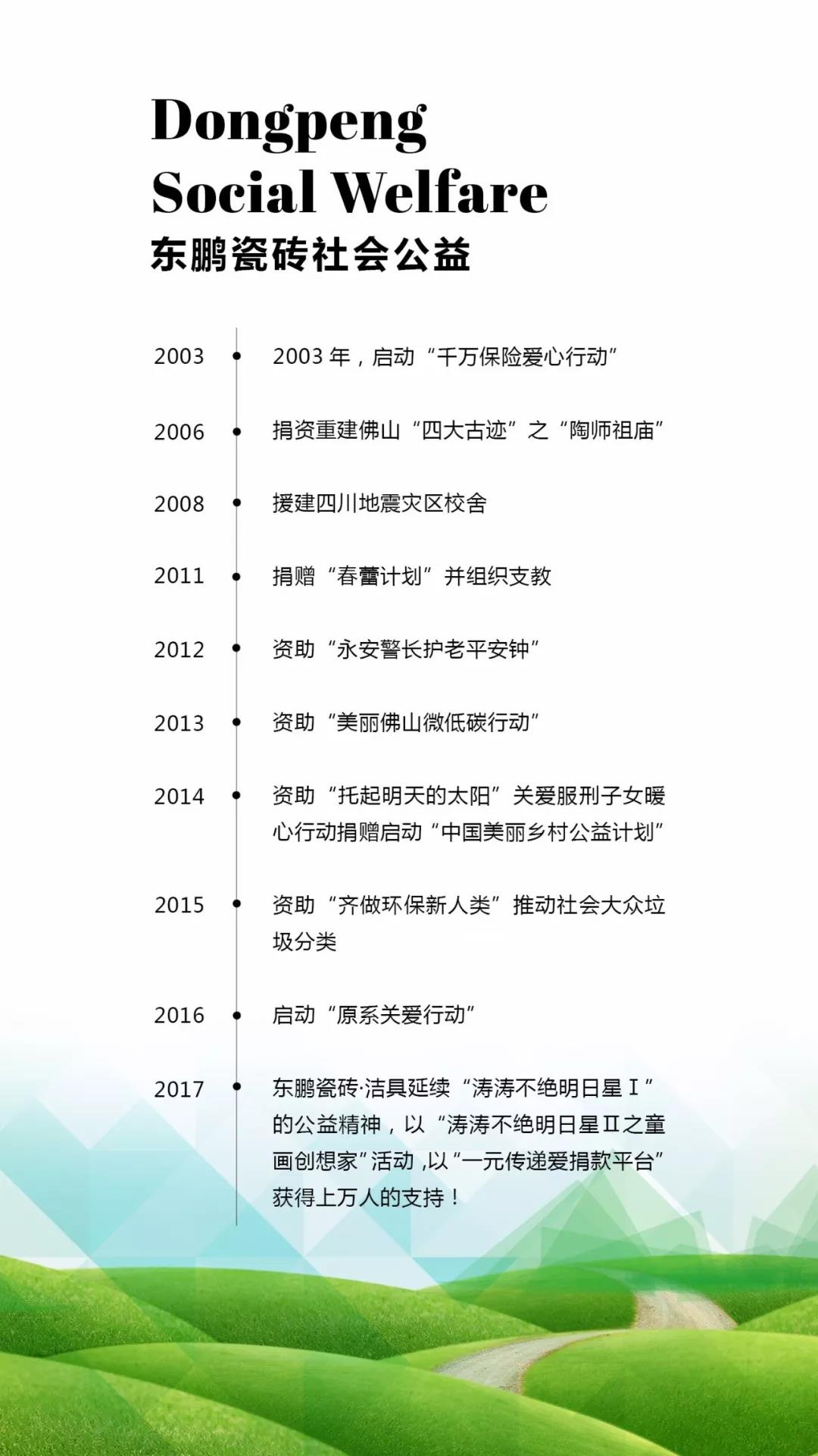 回顧近十年發展歷程,東鵬積極踐行社會責任,熱心公益事業,自1999年出資贊助秋色巡游活動到2012年參與發起成立佛山公益慈善聯盟,至今,東鵬公益慈善行動見證著東鵬踐行社會責任的足跡: