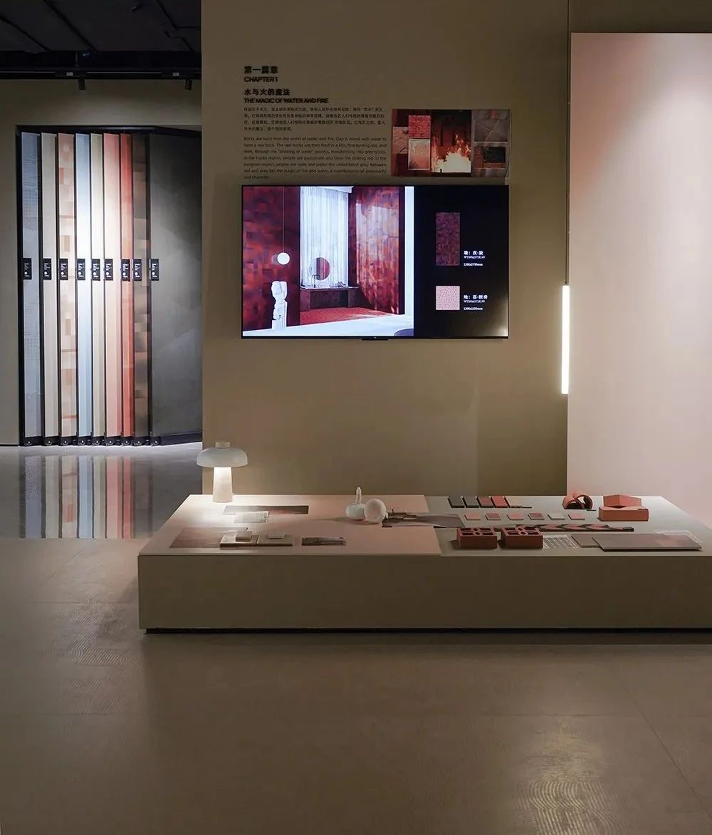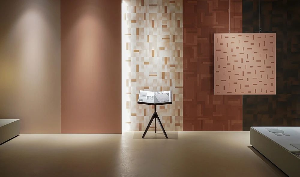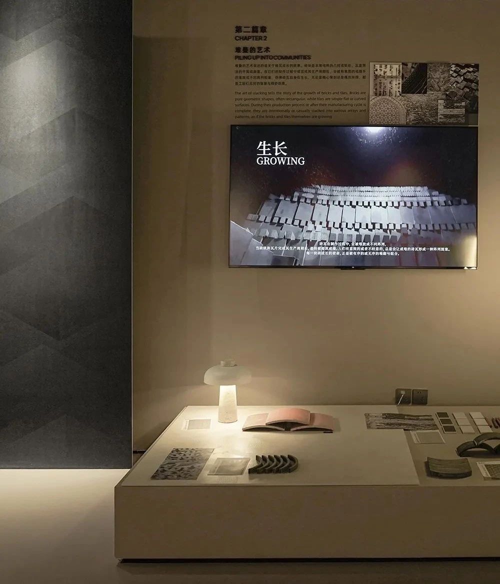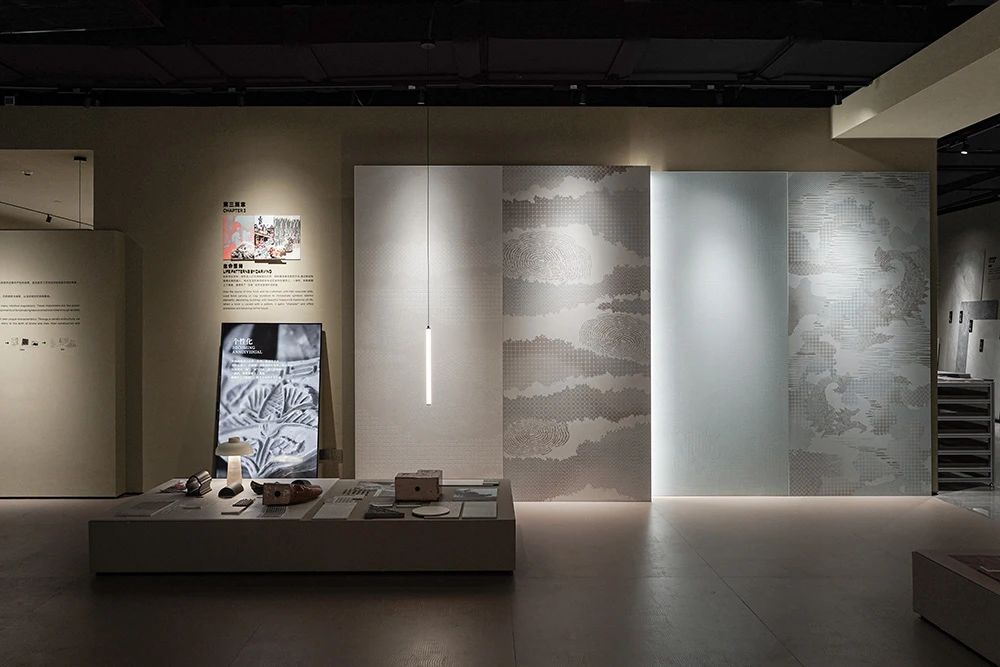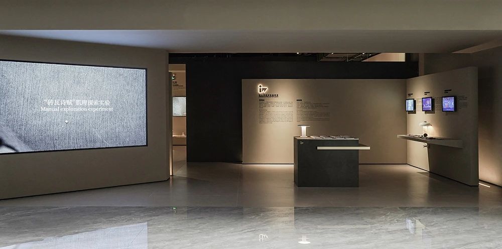 展館開篇圍繞探索未來世界的三大關系為主線,推出基于品牌哲學下的產品解決方案,融合了經典產品與創新科技,包含三大產品系列、八大產品材質、三種光澤、八種規格、十五種質感。IW展廳聚焦在三大產品線:“匠心系列”、“自然系列”、“當代系列”,通過展臺上的展陳物件,從靈感起源到材質組合,結合美術館級燈光的烘托下,光影交映間形成了產品的多維度藝術演繹。隨著觀者在匠心系列空間游走,屬地文化為主題的空間輔以情緒板、產品故事詩篇、產品靈感明信片、調研走訪紀錄片等多種物料,配合溫韻的燈光渲染,展現了手工藝與科技融合的藝術結晶,所到之處,細節之中,皆有故事。