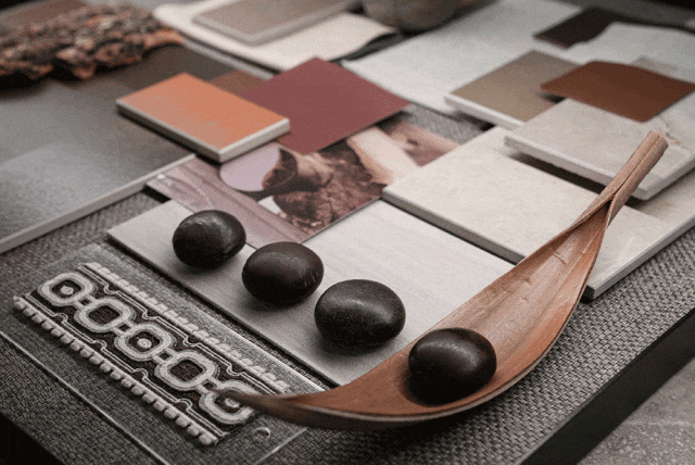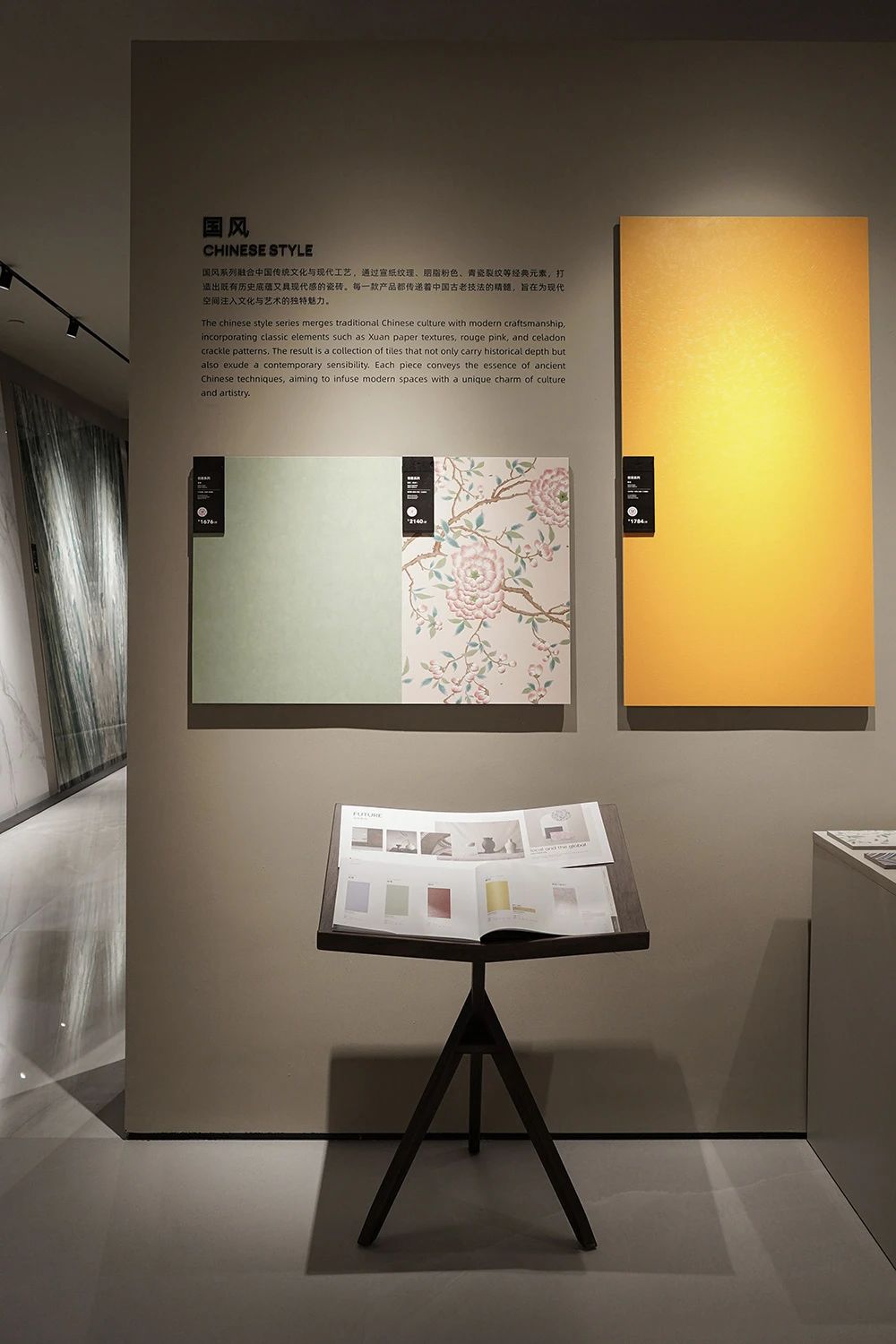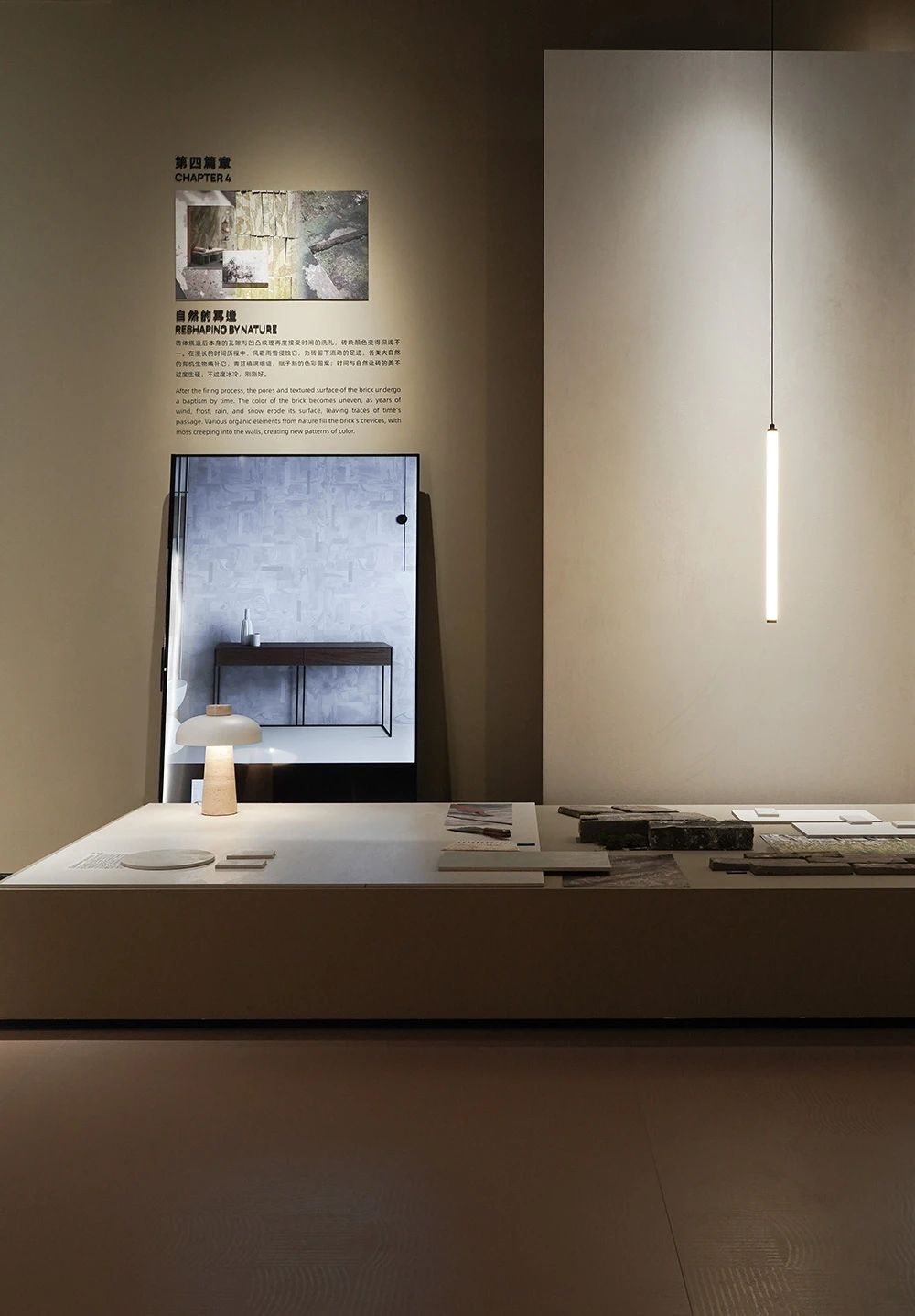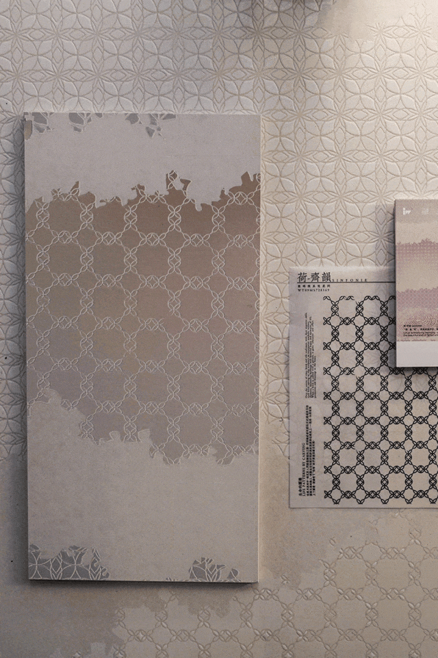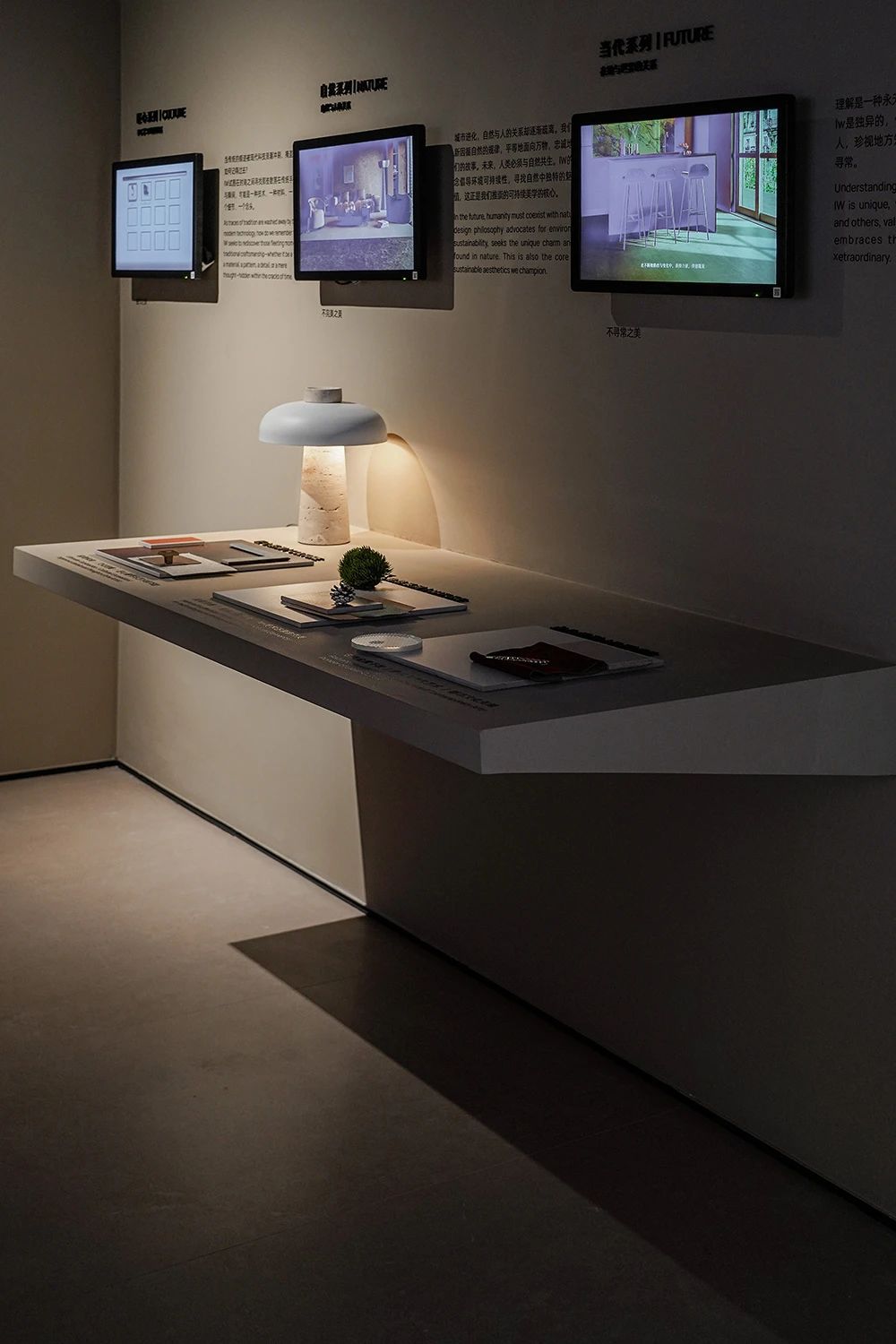 展館開篇圍繞探索未來世界的三大關系為主線,推出基于品牌哲學下的產品解決方案,融合了經典產品與創新科技,包含三大產品系列、八大產品材質、三種光澤、八種規格、十五種質感。IW展廳聚焦在三大產品線:“匠心系列”、“自然系列”、“當代系列”,通過展臺上的展陳物件,從靈感起源到材質組合,結合美術館級燈光的烘托下,光影交映間形成了產品的多維度藝術演繹。隨著觀者在匠心系列空間游走,屬地文化為主題的空間輔以情緒板、產品故事詩篇、產品靈感明信片、調研走訪紀錄片等多種物料,配合溫韻的燈光渲染,展現了手工藝與科技融合的藝術結晶,所到之處,細節之中,皆有故事。