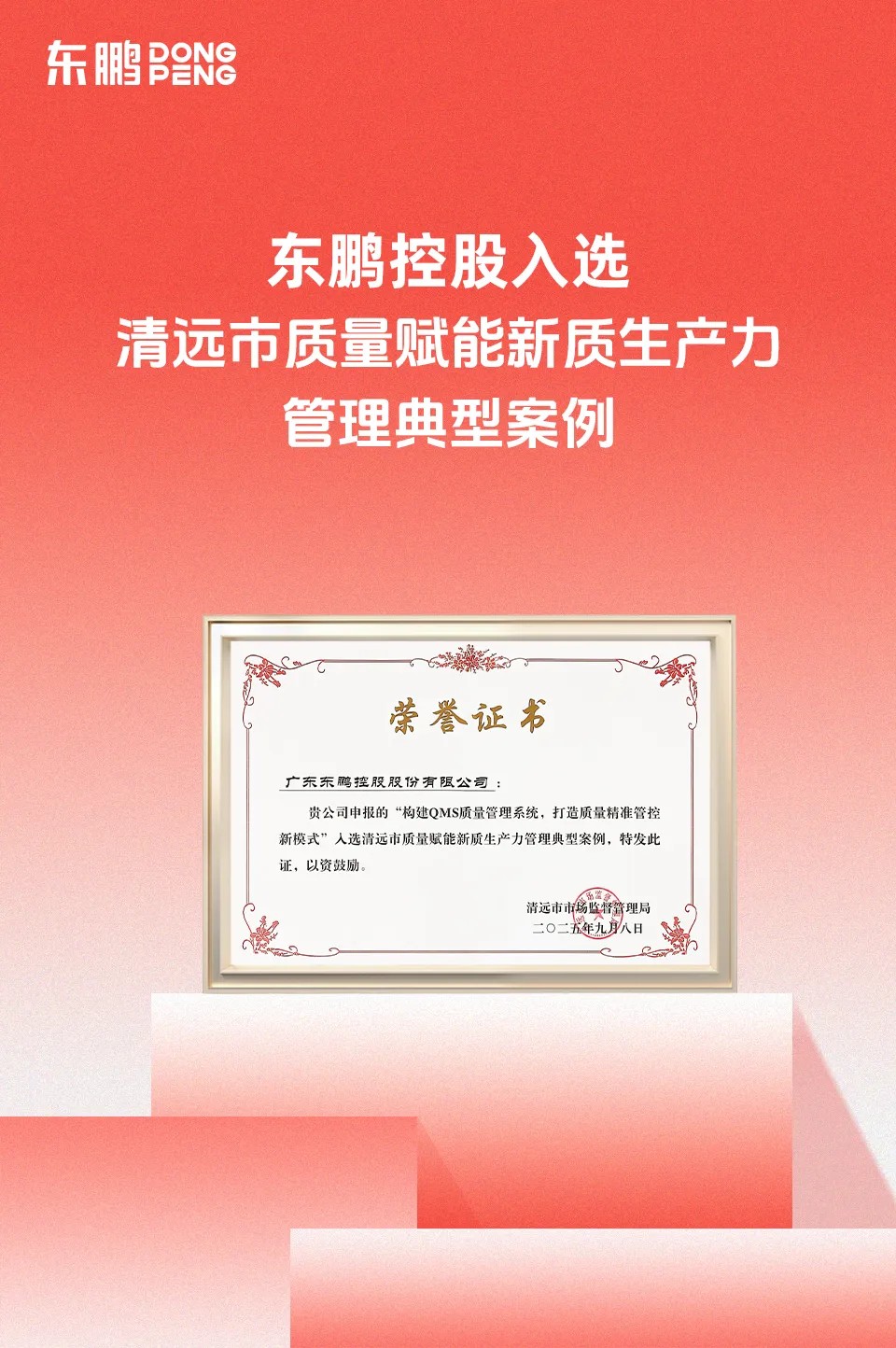 未來,東鵬控股將繼續深化全面質量管理,強化科技創新與質量融合,助力質量強國建設,為中國制造向中國創造、中國品牌向世界品牌轉變持續貢獻力量。