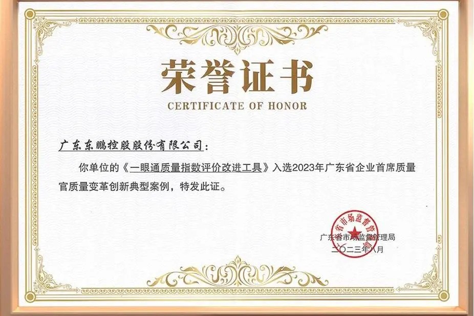 東鵬控股在持續推動質量提升的過程中,逐步形成了“質量為本、精益求精”的企業質量文化。這種文化不僅深入企業運營的每一環節,也為東鵬贏得了廣泛的社會認可與榮譽:公司先后榮獲廣東省政府質量獎、清遠市政府質量獎,并自主開發出獨具特色的質量管理評價工具——“一眼通質量指數評價改進工具”,并榮獲廣東省市場監督管理局頒發的“質量變革創新典型案例”獎項。